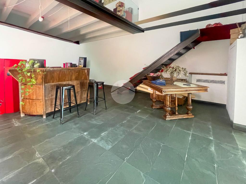 Una scala in ferro conduce al soppalco, che offre uno spazio aggiuntivo ideale per garantire maggiore riservatezza.