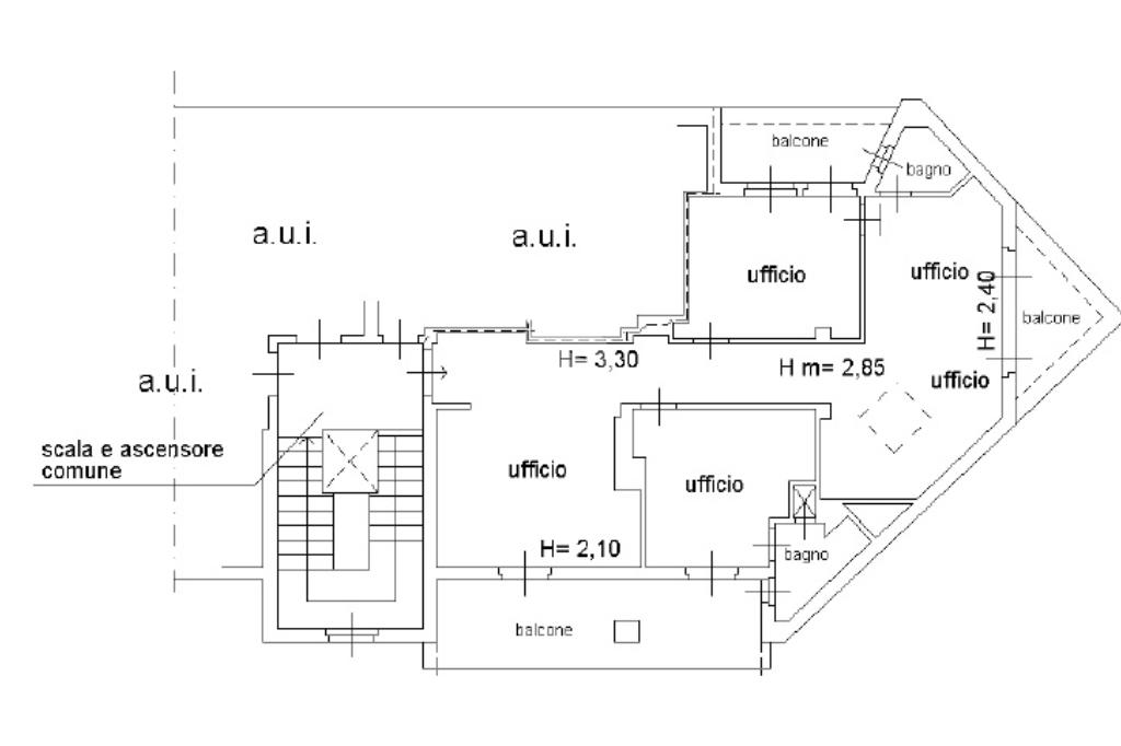 -Superficie: l’ufficio ha una superficie complessiva di 105 mq ed è diviso in n. 4 ambienti con balcone.