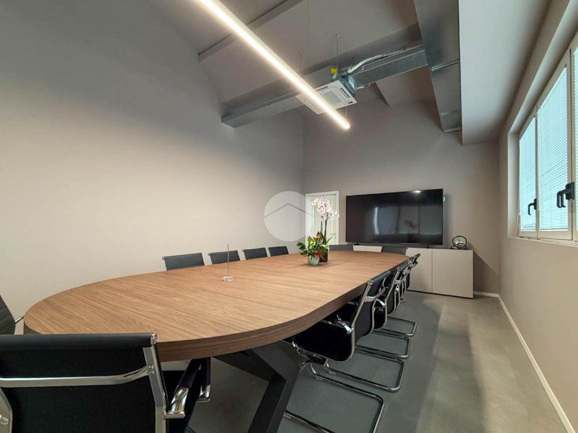 Anche la sala riunioni è attualmente arredata con ampio tavolo centrale e monitor a parete.
