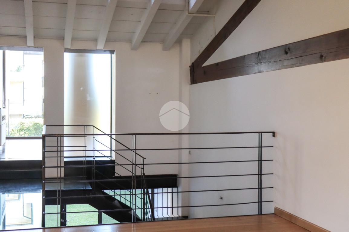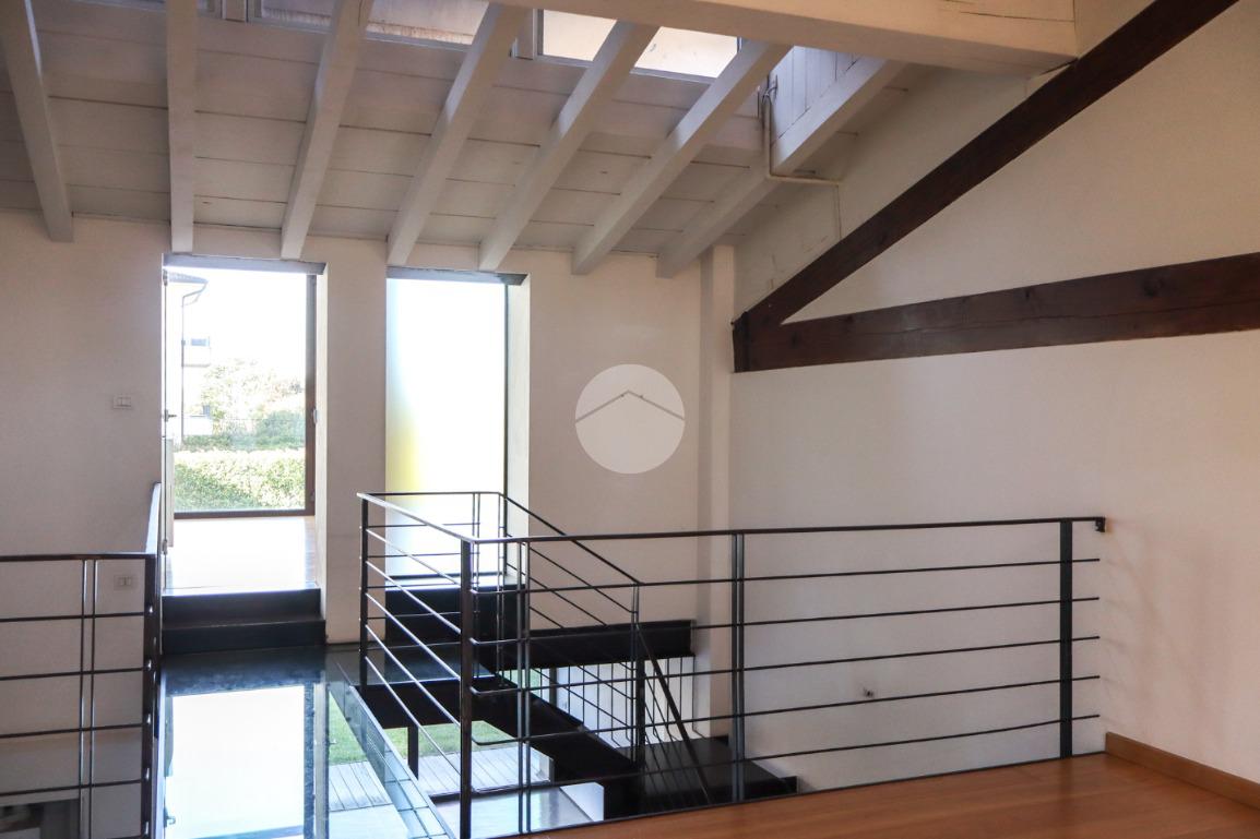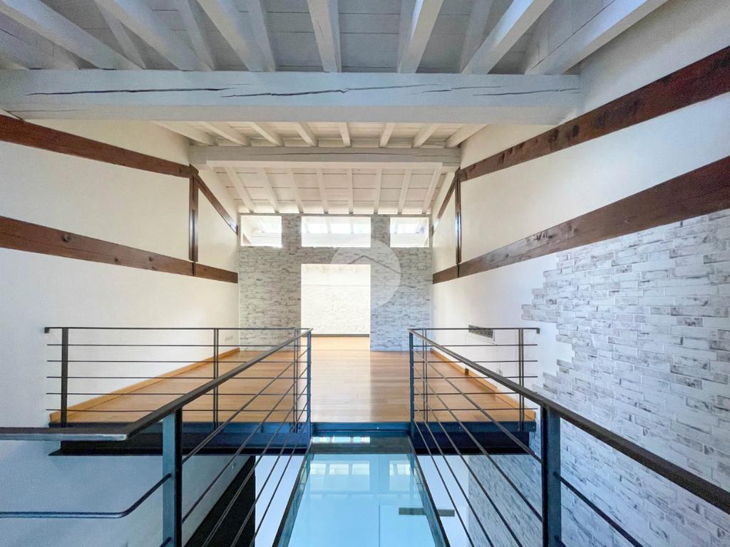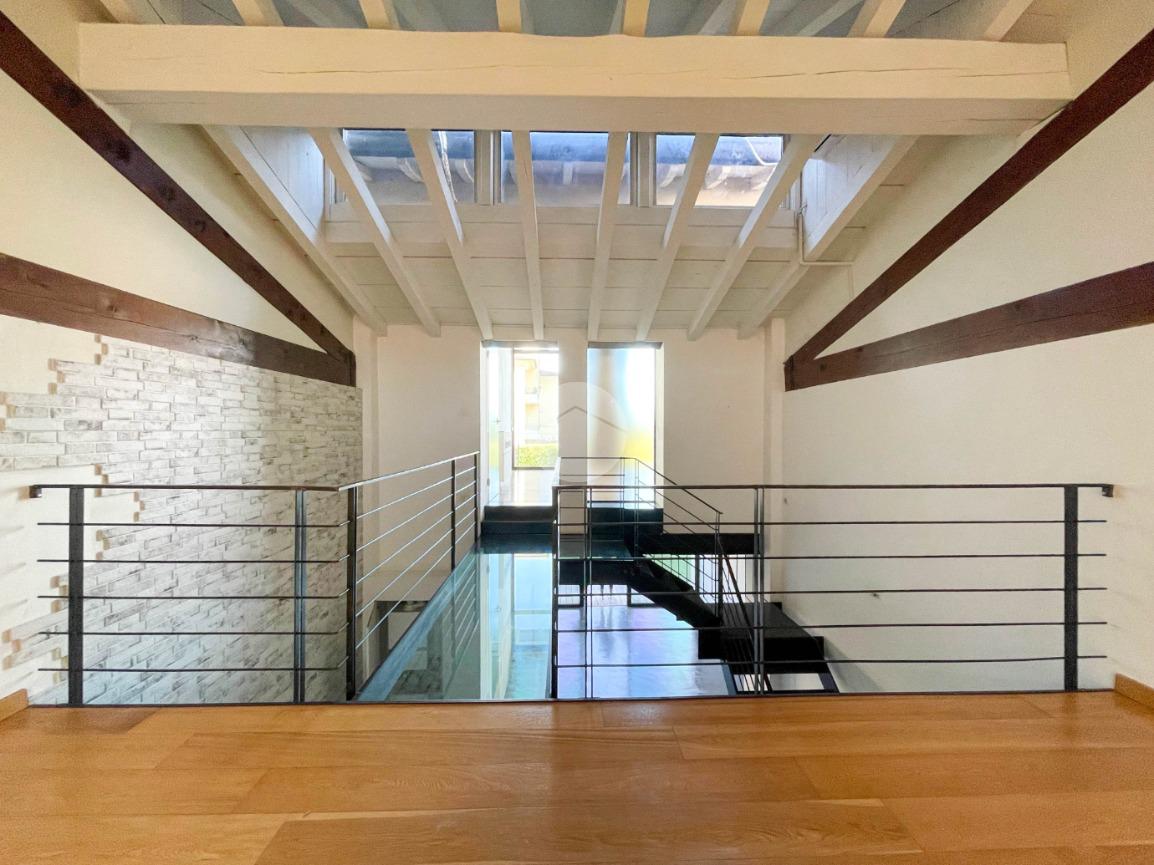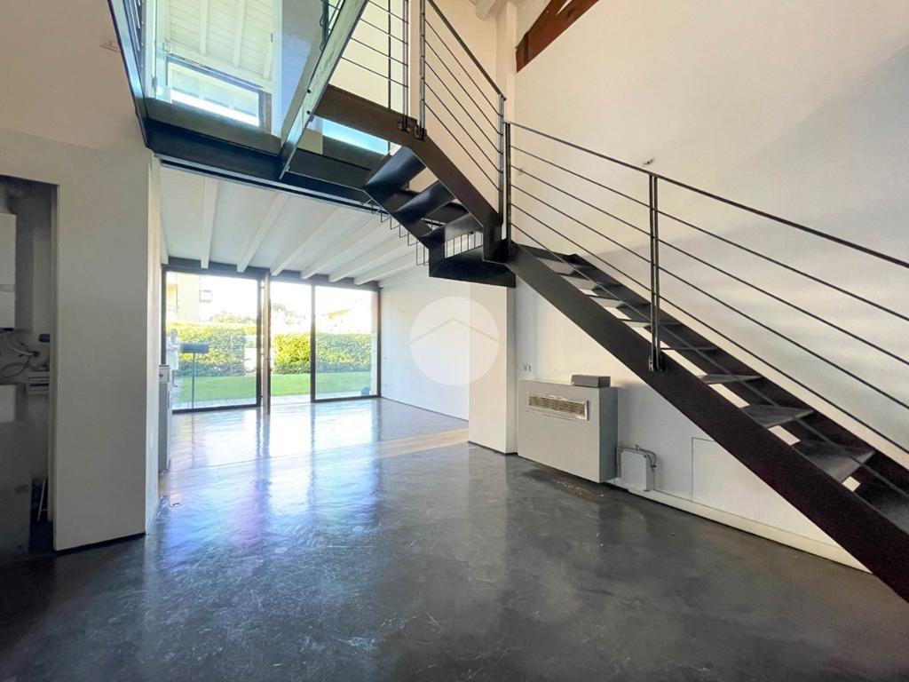 Una scala in ferro conduce al soppalco, che offre uno spazio aggiuntivo ideale per garantire maggiore riservatezza.
