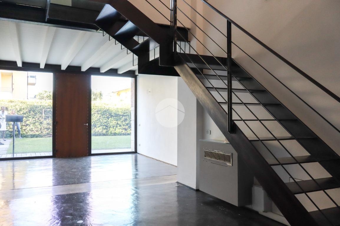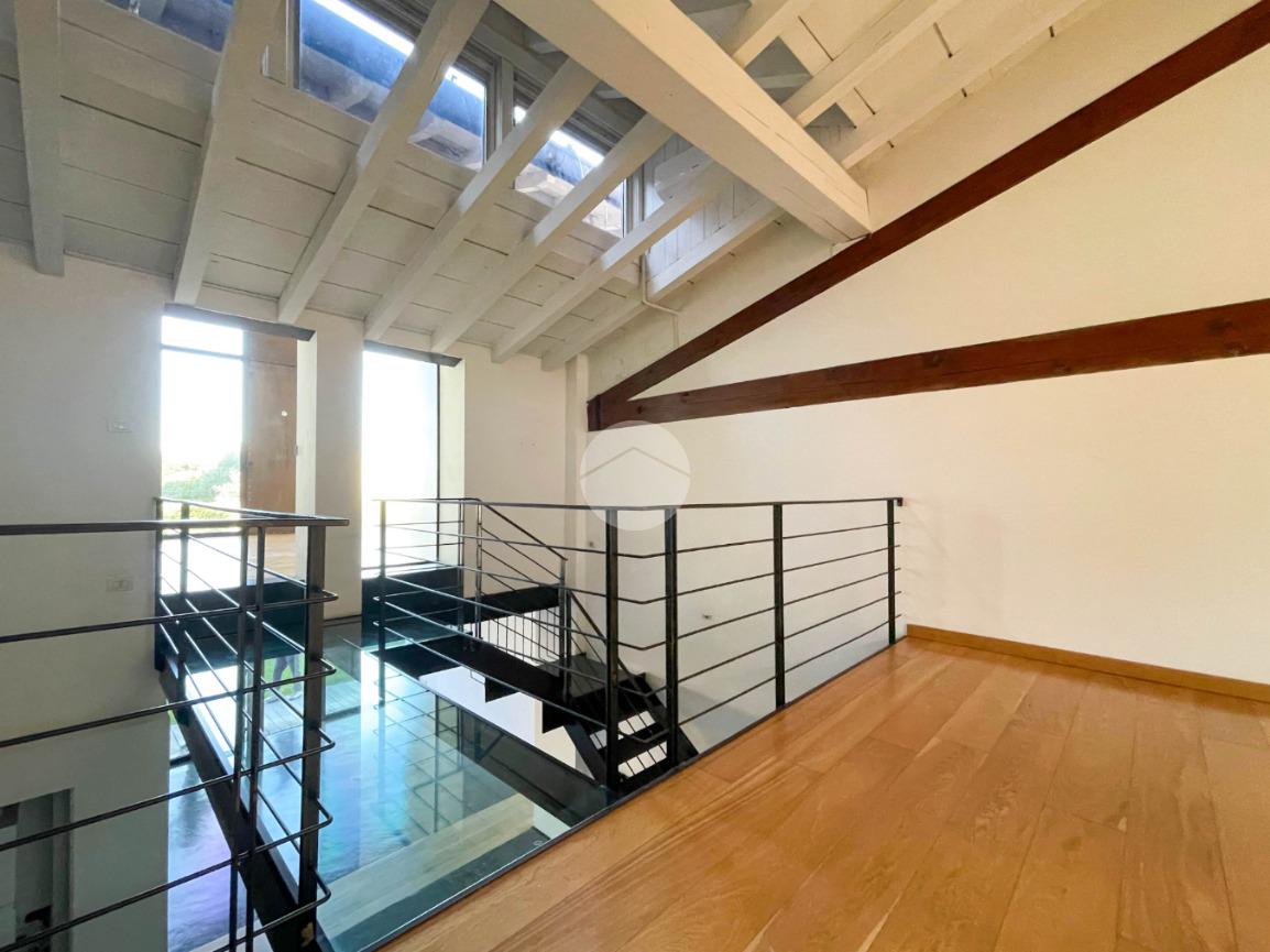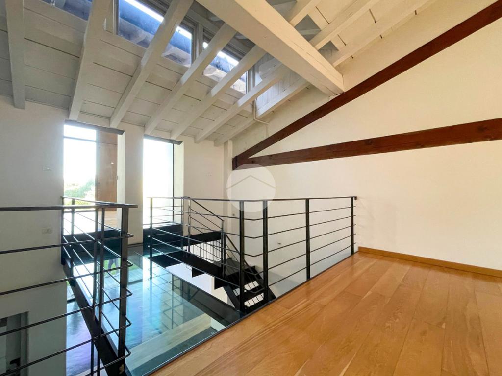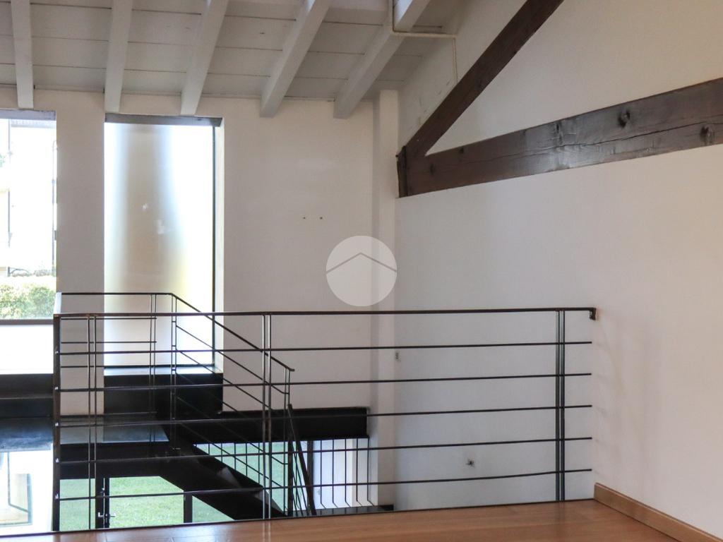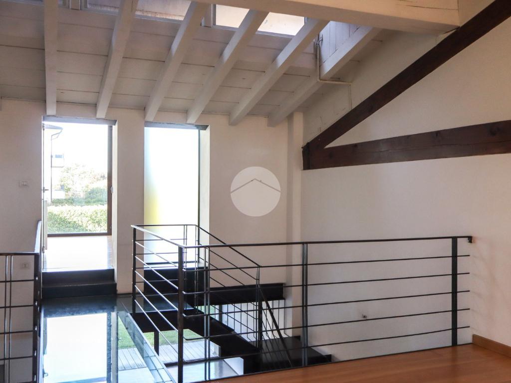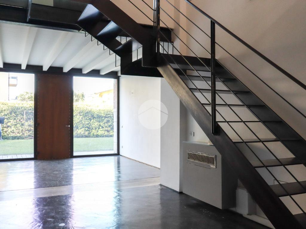 Una scala in ferro conduce al soppalco, che offre uno spazio aggiuntivo ideale per garantire maggiore riservatezza.